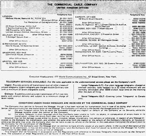 CCC London cable form used after the move from Wormwood Street to the new office in Bastwick Street.